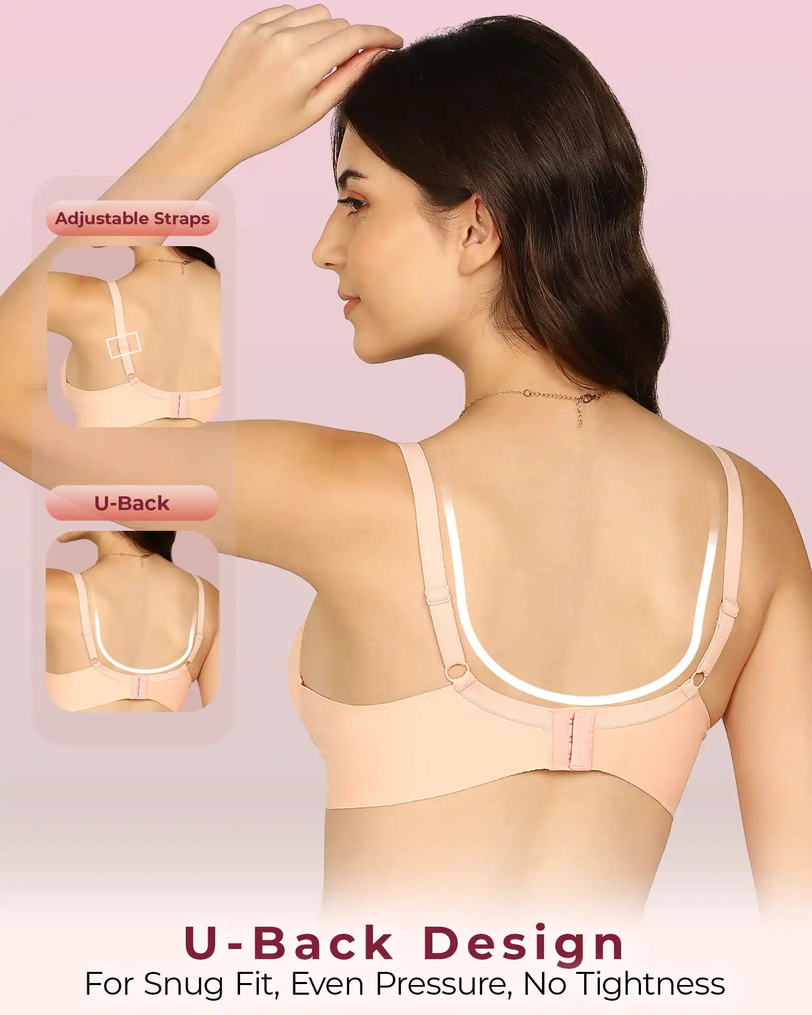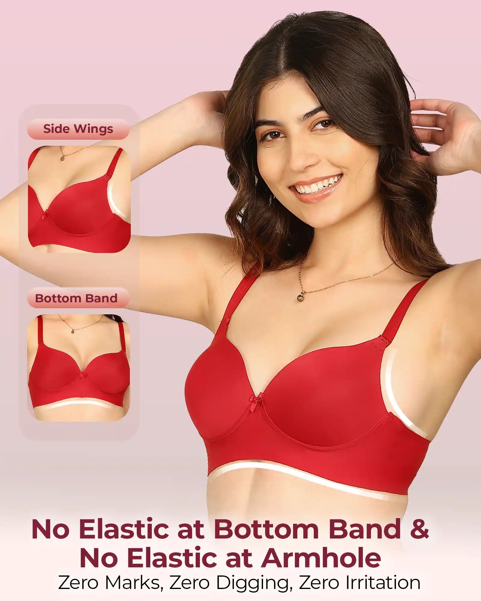 Enhance your natural shape with our Easy-Fit Maximiser Bra. Designed with advanced stitch-free easy-fit bonding technology, it offers a smooth, invisible look under any outfit. The heavily padded cups gives a boosted lift and add fullness, creating a rounder, more defined silhouette. With an elastic-free bottom band and sidewings, it ensures zero rashes, red marks, or irritation, keeping you comfortable all day. Breathable fabric, broad wings, and high coverage provide secure support while maintaining a flattering contour—making this bra the perfect blend of comfort, confidence, and style.