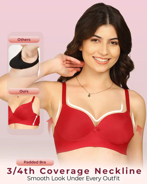 Enhance your natural shape with our Easy-Fit Maximiser Bra. Designed with advanced stitch-free easy-fit bonding technology, it offers a smooth, invisible look under any outfit. The heavily padded cups gives a boosted lift and add fullness, creating a rounder, more defined silhouette. With an elastic-free bottom band and sidewings, it ensures zero rashes, red marks, or irritation, keeping you comfortable all day. Breathable fabric, broad wings, and high coverage provide secure support while maintaining a flattering contour—making this bra the perfect blend of comfort, confidence, and style.