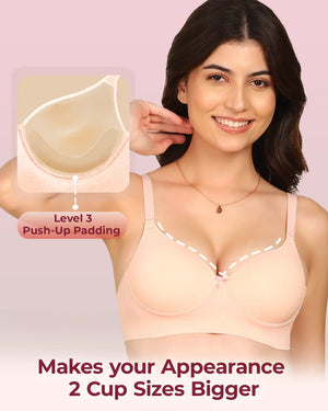 Turn up the confidence with our Easy-Fit Push-Up Bra. Designed with advanced stitch-free bonding technology, it stays invisible under any outfit while giving you a smooth, flawless finish. The push-up cups add natural lift and volume, enhancing your curves with a rounded, fuller shape. Made with elastic-free bottom band and sidewings, it eliminates digging, rashes, and red marks for irritation-free comfort. Breathable, skin-friendly fabric feels like a second skin, making this bra perfect for everyday wear or special occasions when you want extra definition with total ease.