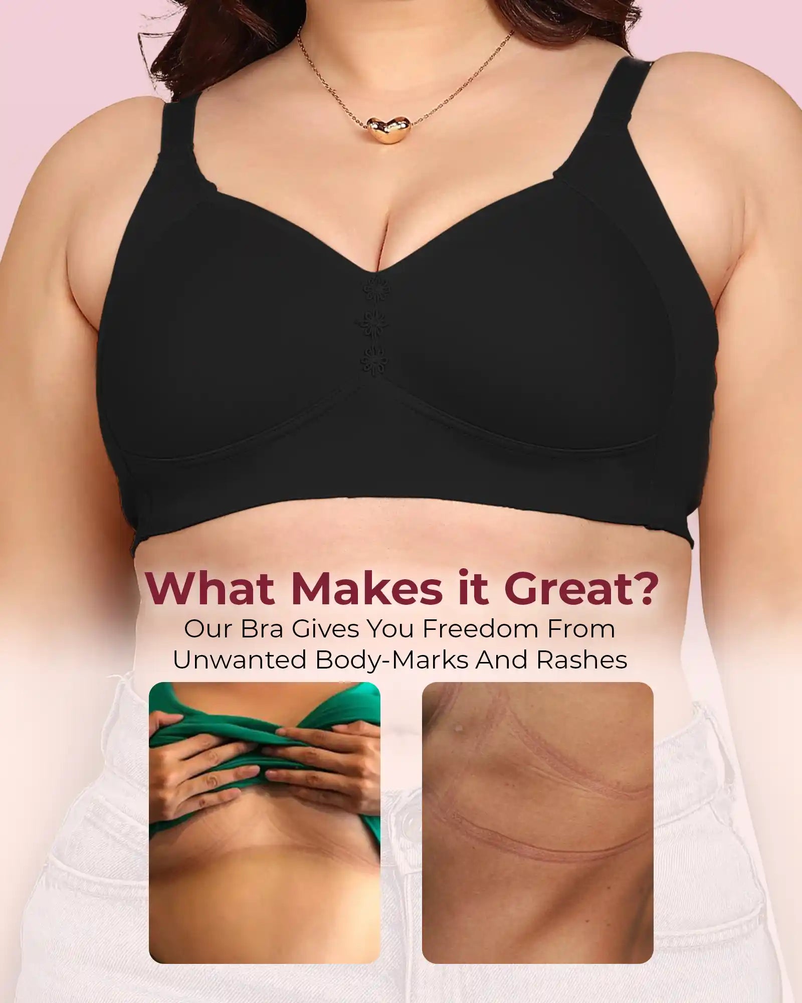 Elastic-Free Bottom Band: The bottom band is crafted without traditional elastic to prevent pinching, rashes, or body marks—just soft and irritation-free support.